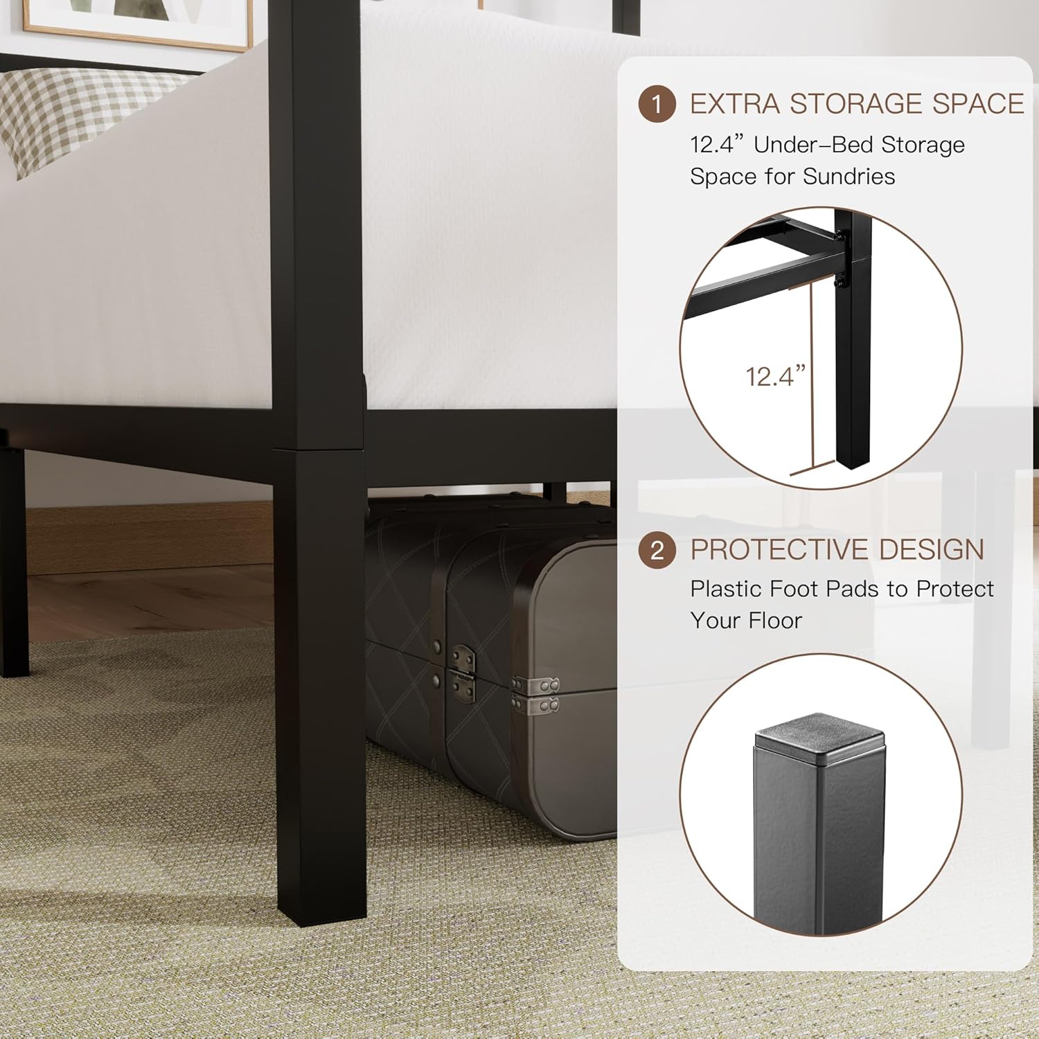 ikalido Queen Size Metal Canopy Bed Frame, Modern Four-Poster Platform Bed Frame, Mattress Foundation, Under-Bed Storage Space, No Box Spring Needed, Black