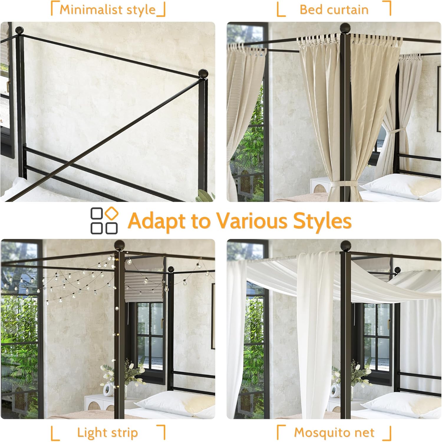 King Size Canopy Bed Frame, Four Poster Metal Canopy King Size Bed Frame, Heavy Duty Mattress Foundation with Underbed Storage, No Box Spring Needed, Easy Assembly, Black