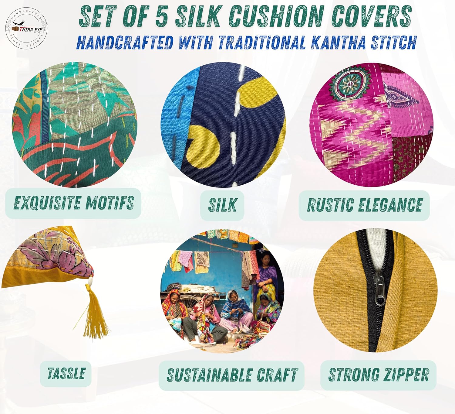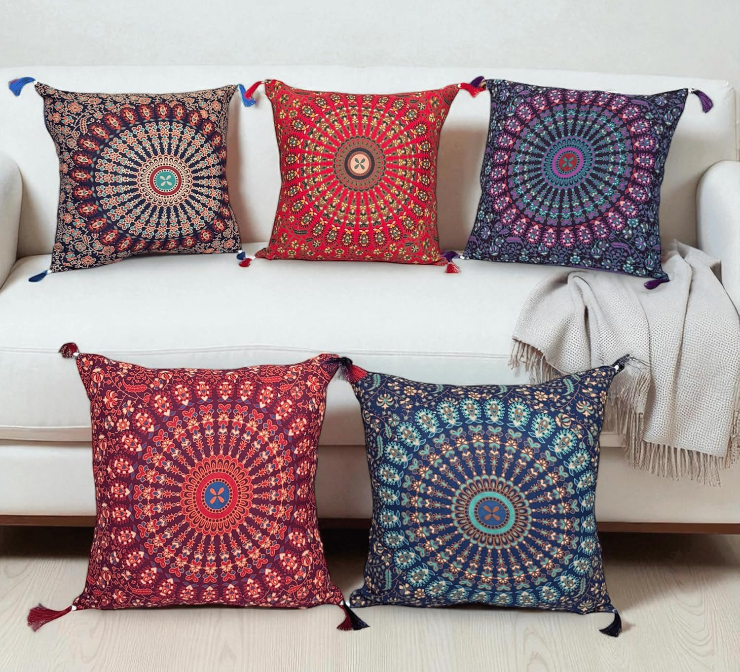 Set Of 5 Boho Throw Pillow Covers - Silk Decorative Cushions For Sofa, Couch, And Bed – Bohemian, Indian & Moroccan Inspired Home DéCor For Living Room (Silk Patch Cushion Cover, 18X18 Inches)